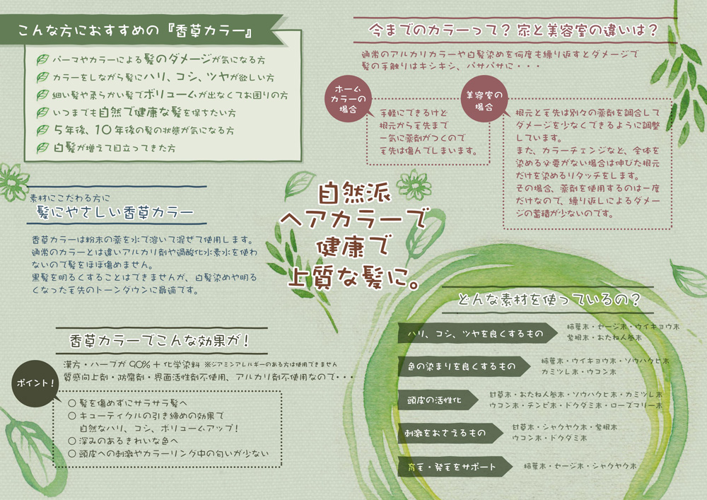 通常のカラーリング剤と違い、アルカリ剤、酸化水素水を使わないので繰り返し染めてもダメージはほとんどありません。